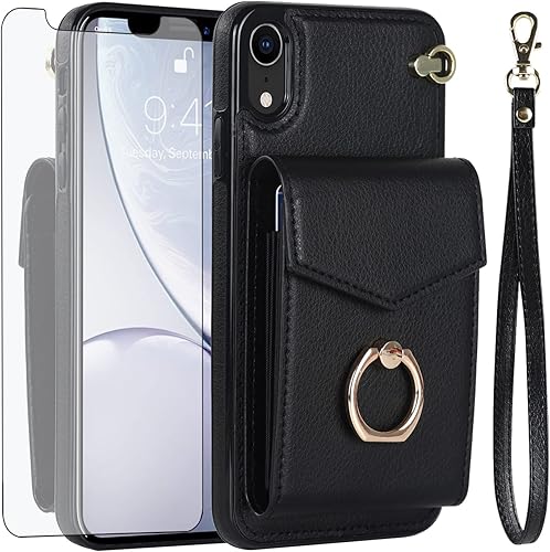 Asuwish Funda de teléfono para iPhone XR 6.1 con protector de pantalla de vidrio templado y anillo de bloqueo RFID, tarjetero para celular iPhoneXR