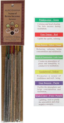 2 palitos cada uno en total 14 palitos Incienso de resina natural elaborado con ingredientes 100% puros. El incienso hecho por Auroshikha es considerado como uno de los mejores inciensos del mundo. Auroshikha ha capturado las fragancias ligeras y delicadas de la naturaleza, hechas con amor en el Ashram Sri Aurobindo en Pondicherry