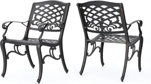 Las sillas de comedor Sarasota aportarán lujo y comodidad a su espacio al aire libre. Hechas de aluminio fundido, estas sillas duraderas de alta calidad cuentan con un respaldo de malla y un asiento de descanso. El acabado de bronce antiguo es neutro para combinar con cualquier mueble de exterior y se mantendrá en cualquier condición climática. Ya sea en tu patio trasero, patio, terraza o incluso en tu restaurante al aire libre, disfrutarás de estas sillas durante años.