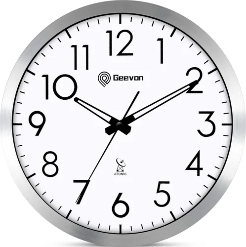 【Ajuste automático y alta precisión】El reloj de pared atómico se restablece regularmente mediante control de radio para que coincida con el reloj atómico de Estados Unidos en Colorado y se ajusta automáticamente para el horario de verano (opción de encendido/apagado). Siempre sea preciso en un segundo, ya que recibe actualizaciones diarias de WWVB. Diseño moderno: los relojes de pared atómicos funcionan con pilas con marco de metal de aluminio cepillado plateado resistente que añade estilo y longevidad, diseño moderno complementa la decoración de cualquier habitación. Reloj atómico digital Geevon perfecto para comedores, salas de estar, habitaciones familiares, dormitorios, sala de estudio, cocina, oficina y sala de reuniones. Fácil de leer: esfera de reloj redonda de 12 pulgadas, más fácil de leer desde largas distancias. Esfera blanca simple con elegantes manecillas de metal negro, pantalla analógica de números arábigos negros, proporciona el contraste perfecto para una máxima legibilidad. Fácil de usar: los ganchos incluidos permiten una fácil instalación. Funciona con pilas y el movimiento de cuarzo de baja potencia requiere 1 batería AA, no incluida (una buena batería se puede utilizar durante más de un año, ahorro de energía) Garantía de satisfacción completa: si no estás satisfecho con nuestro reloj atómico por cualquier razón, devuélvelo en cualquier momento para un reembolso 100% sin complicaciones. Con esa garantía no hay riesgo, simplemente agregue uno a su carrito ahora.