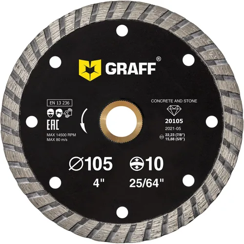 UNIVERSAL: La hoja de diamante para amoladora angular está diseñada para uso doméstico y bricolaje. El disco de corte turbo GRAFF está diseñado para trabajar con hormigón, piedra artificial, bandera de pavimento y bordillo. AUMENTO TIEMPO DE FUNCIONAMIENTO: La hoja de diamante para amoladora angular está construida de modo que durante el funcionamiento se calienta más lentamente, lo que conduce a un aumento en el tiempo de funcionamiento. Duradera: la hoja de amoladora angular de diamante GRAFF puede autoafilarse borrando granos de diamante durante el funcionamiento. Para afilar es necesario hacer dos o tres cortes en silicio o piedra abrasiva. ALTA SOLIDAD: La hoja de diamante para cerámica y baldosas está diseñada para un corte preciso utilizando amoladoras angulares de pequeño tamaño con eje de 7/8 pulgadas (5/8 pulgadas). Esta hoja de sierra tiene un marco de acero mejorado que garantiza una alta solidez durante el funcionamiento. Especificaciones: Diámetro: 4 pulgadas (4.134 in), Árbol: 7/8 pulgadas (0.875 in) con adaptador de 5/8 pulgadas (0.625 in), Kerf: 0,091 pulgadas (0.091 in), Altura del segmento: 0,394 pulgadas (0.394 in). La hoja de sierra de hormigón de diamante tiene un cuerpo resistente con 0.047 pulgadas (0.047 in) de grosor.
