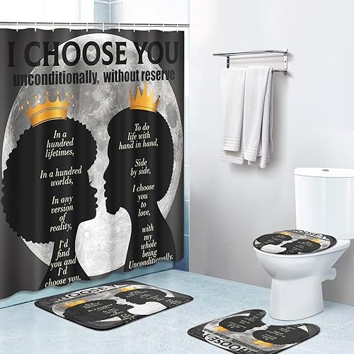 Juego de 4 cortinas de ducha, dos amantes con alfombras antideslizantes, cubierta para tapa de inodoro y tapete de baño, juego de decoración
