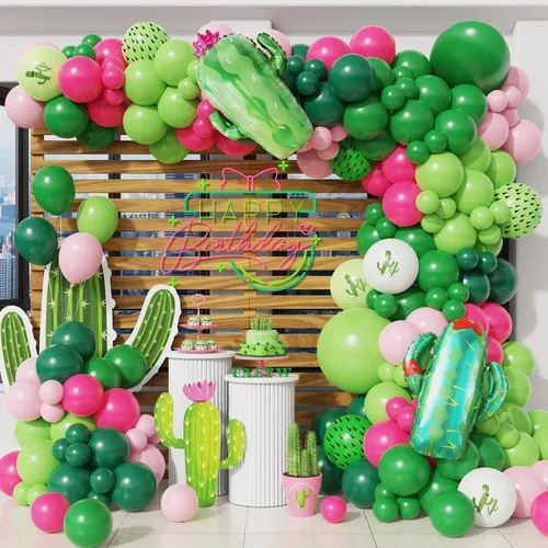 El paquete incluye: 30 globos de color verde oscuro. 31 globos verdes. 31 globos verdes frutales. 20 globos rosados. 20 globos de color rosa intenso. 8 globos de látex de cactus 2 globos de papel de aluminio de cactus 1 cinta de tira de arco de globos. 1 rollo de pegamento de 100 puntos