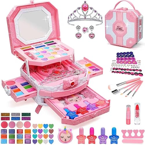 Nuevo juego de maquillaje para niños de 63 en 1: Incluye juego de joyería (2 pendientes, 1 anillo, 1 pulsera, 1 collar, 1 corona), juego de maquillaje (18 sombras de ojos, 6 brillos de labios, 4 polvos brillantes, 4 rubores, 2 pintalabios, 1 polvo prensado, 1 esponja), juego de manicura (1 lima de uñas, 1 separador de dedos, 4 esmaltes de uñas, 3 pegatinas para uñas), juego de herramientas de maquillaje (5 brochas de maquillaje, 2 brochas de sombra de ojos, 2 brochas de rubor y 2 brochas de brillo de labios). Una vez que las niñas tengan este maquillaje para niños, serán las princesas más hermosas Maquillaje seguro y lavable para niños: Proteger la salud de los niños es nuestra máxima prioridad. El kit de maquillaje para niñas ha pasado todas las normas de seguridad de juguetes estadounidenses (CPSIA, CPC, certificado ASTM) y las pruebas de piel para niños. Prometemos que no son tóxicos, sin plomo, sin cadmio ni ftalatos. Puedes oler una fragancia ligera cuando la abras con maquillaje para niños, y el kit de maquillaje suave para niños te traerá a ti y a tus hijos una doble diversión Combinación de educación y entretenimiento: los niños pueden compartir el maquillaje de las niñas con amigos y familiares, acercarse unos a otros. Dale forma y mejora la creatividad, imaginación, capacidad estética y capacidad práctica de los niños, permite que los niños disfruten de juegos de maquillaje, diseñen su propio maquillaje para realizar sus sueños de princesa Sin Desorden y Almacenamiento Fácil: Las princesas pueden poner todo el maquillaje de los niños en la caja de cosméticos después del maquillaje, y desarrollar un buen hábito de amar el almacenamiento. Al mismo tiempo, es fácil de llevar, las niñas pueden llevar sus queridos juguetes de maquillaje a cualquier lugar, como viajes, fiestas de maquillaje, etc Regalo Perfecto para Niñas: Este kit de maquillaje para niñas es el regalo perfecto para hacer felices a las niñas y hacerlas gritar, deja que tu bebé realice el sueño de la princesa. Este es un regalo ideal para niñas de 4, 5, 6, 7, 8, 9, 10, 11, 12 años para fiestas de cumpleaños, cosplay, representaciones escolares, Navidad, Halloween o cualquier otra festividad