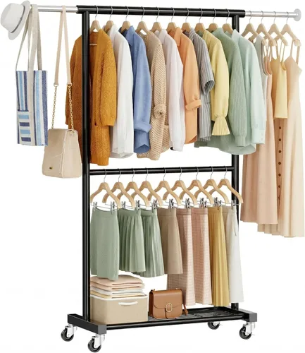 【Espaciosa 50 pulgadas de ancho】Mide 50.23 pulgadas de ancho x 15.3 pulgadas de profundidad x 64.17 pulgadas de alto. La barra horizontal superior extensible de 34 a 50 pulgadas proporciona un abundante espacio para colgar. La altura vertical se puede ajustar fácilmente de 26.7 a 31 pulgadas, y los estantes de malla resistentes te proporcionan un mayor espacio de almacenamiento, lo que hace que la organización diaria sea muy fácil Diseño de soporte fiable: nuestro perchero emplea una estructura en forma de T y acero al carbono grueso de 0.866 pulgadas para un soporte óptimo, y puntos soldados sin problemas que resultan en una estructura duradera que soporta una carga de hasta 150 libras Lo suficientemente alto para cualquier ropa: este perchero de 62 pulgadas de alto (de la parte superior a la base sin incluir las ruedas) es perfecto para una variedad de artículos de ropa, desde camisas y suéteres hasta faldas largas y vestidos. Instrucciones detalladas y piezas para un montaje rápido y fácil están incluidas en el paquete 【Fácil movilidad y seguridad】El perchero está equipado con cuatro ruedas omnidireccionales de alta resistencia por lo que es fácil de mover a diferentes habitaciones, incluso cuando está completamente cargado. Dos ruedas bloqueables mantienen el estante firmemente en su lugar cuando sea necesario Versátil y estético: el estante no solo ofrece espacio para la ropa, sino que también incluye un estante para zapatos o cajas de almacenamiento. Dos espaciadores antideslizantes en la parte superior evitan que los artículos se caigan. Ideal para dormitorios, guardarropas, lavaderos o entradas. Mantiene tu espacio limpio y organizado, mientras se combina perfectamente con varios estilos de hogar
