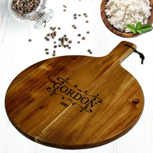 Garantía de por vida de PICNIC en ASCOT USA - Diseñadores y fabricantes durante más de 25 años de una amplia gama de platos para servir queso y embutidos de madera dura de alta calidad que proporcionan productos de la más alta calidad en el mercado. Tablero 100% de madera dura de acacia de 12 pulgadas de diámetro para preparar alimentos y servir embutidos a amigos y familiares Tabla de cortar grabada personalizada personalizada de queso de madera dura/embutidos de Acicia Mide 17 pulgadas de largo x 12 pulgadas de ancho. Ideal para carne, pizza, pan, panecillos, fruta y queso Una gran idea de regalo: sorprende a tus amigos y familiares y ofréceles una manera elegante de disfrutar de sus quesos y aperitivos favoritos. Es un gran regalo de inauguración de la casa, compromiso, boda, aniversario, jubilación, cumpleaños, Navidad, vacaciones o anfitriona