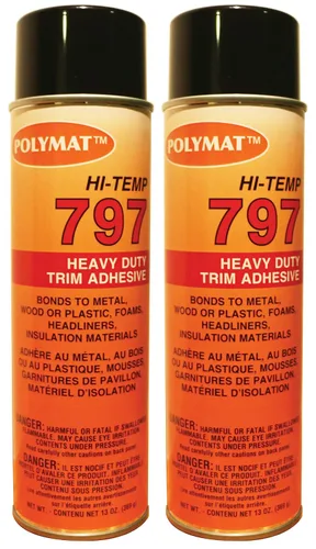 Revestimiento de techo y pegamento de tela de grado industrial para alta temperatura (160F), unión resistente de tapas de vinilo, revestimientos de techo y almohadillas silenciadoras de capó. Resistente al agua (para uso marino) Pegamento resistente, ideal para pegar una amplia gama de materiales (techos, alfombras, espumas, papel, cartón, fieltro, tela) a metales, madera y tableros duros. Polymat Adhesivo 797 diseñado para pegar tapas de vinilo, techos pesados y almohadillas silenciadoras de capó donde se necesita alta resistencia y resistencia al calor. 2 latas de 797 adhesivos de poliéster de alta temperatura