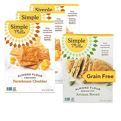 Contiene 3 cajas de galletas de harina de almendras Simple Mills Farmhouse Cheddar sin gluten y 1 caja de mezcla para hornear Simple Mills Almond Flour Artisan Bread. Galletas de harina de almendras hechas con queso real para alimentarte; la mezcla para hornear puede hacer panecillos, pan plano o pan. Las galletas están certificadas sin gluten, sin OMG, sin granos y aptas para paleo. La mezcla para hornear no contiene gluten, granos, soja, maíz y lácteos. La mezcla para hornear también es paleo, vegana y verificada por el Proyecto No OGM. Simple Mills productos elaborados con ingredientes enteros ricos en nutrientes y nada artificial.