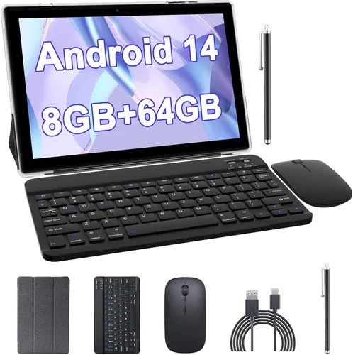 【Nueva tablet Android 14】La tablet de 10 pulgadas está equipada con el último sistema Android 14, que ha sido mejorado en todos los aspectos de la operación del sistema, con un tiempo de respuesta más rápido y más enfoque en la privacidad y seguridad del usuario. También agrega muchas operaciones interesantes y convenientes, lo que mejora en gran medida la experiencia operativa del usuario 【Tablet 2 en 1 con teclado】Tablet Android 14 viene con teclado, ratón, lápiz capacitivo y estuche protector plegable, para darte trabajo, vida y entretenimiento, puedes cambiar directamente entre laptop y tablet en cualquier momento 【8 GB de RAM + 64 GB de ROM + expansión de 1024 GB】La tableta Android viene con 8 GB (2 GB + 6 GB) de RAM para una multitarea fluida y un rendimiento eficiente. También cuenta con 64 GB de almacenamiento ROM para aplicaciones, archivos y medios. La ranura para tarjeta micro SD ofrece hasta 1024 GB de memoria ampliable, brindándote opciones ilimitadas (tarjeta no incluida) Pantalla táctil HD de 10.1 pulgadas: captura todos los mejores momentos de la vida con las cámaras duales de alta resolución de la tableta. La cámara frontal de 2 megapíxeles y la trasera de 8 megapíxeles permiten chats de video ultra suaves, así como fotos y videos impresionantes. La tableta de 10 pulgadas cuenta con una pantalla HD IPS de 10.1 pulgadas con una resolución de pantalla de 1280 x 800 y colores vibrantes y brillantes para una experiencia visual más realista 【Batería de larga duración + Entretenimiento】La tableta de 10.1 pulgadas está alimentada por una gran batería de 6000 mAh con un CPU de cuatro núcleos de 2.0GHz de bajo consumo de energía, lo que te permite disfrutar de 8-10 horas de juegos en uso mixto como leer, ver programas de televisión, películas, navegar por la web, escuchar música, comprar, jugar juegos y más