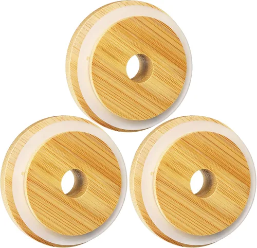 Tapas de bambú para vasos de vidrio, tapas de madera para latas de cerveza de 16 oz con agujero para pajilla, cubierta de repuesto para tarros Mason