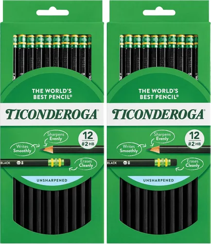 Los lápices de madera Ticonderoga son un paquete de 24 lápices HB con carcasa de madera negra suave. Estos lápices cuentan con una fórmula patentada de grafito extraída de fuentes cuidadosamente controladas que proporciona un rendimiento extra suave y un núcleo de grafito grueso que ofrece líneas anchas y consistentes. Los lápices están hechos de madera de primera calidad cosechada de bosques gestionados de manera responsable, proporcionando un afilado suave y uniforme con una rotura mínima. Los lápices número 2 tienen un acabado lacado negro para un aspecto mate recubierto. También tienen un borrador superior sin látex que elimina las marcas por completo sin manchas y está pegado de forma segura en las virolas verdes y doradas. Estos lápices no son tóxicos y son seguros para los niños. Son parte de la familia de suministros de arte Dixon Ticonderoga que incluye marcas como Prang, Dixon, Pacon y más.