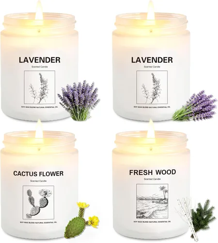 cera de soya Velas Juego de regalo de velas perfumadas de 4 unidades: disfruta de un juego de regalo de 4 velas perfumadas bellamente diseñado con cuatro fragancias únicas que incluyen lavanda, flor de cactus y madera fresca. Perfecto para crear un ambiente relajante en cualquier habitación de tu hogar. Velas de aromaterapia de larga duración: estas velas de soja de aromaterapia están hechas con mechas de cera y algodón de primera calidad para proporcionar una combustión limpia y uniforme, ofreciendo una fragancia duradera para relajación, meditación y comodidad diaria en el hogar. Cera de soja natural para quemaduras limpias: fabricadas con cera de soja natural, estas velas se queman más limpias y producen menos humo que las velas tradicionales, lo que las convierte en velas ideales para dormitorio, baño, oficina y espacios de estar. Fragancia relajante para el hogar: diseñadas para brindar calma y comodidad, estas velas perfumadas para el hogar ayudan a crear un ambiente acogedor como un spa perfecto para el cuidado personal, yoga, relajación y noches tranquilas. Regalo perfecto para mujeres: este elegante juego de velas para mujer es un maravilloso regalo para cumpleaños, inauguración de la casa, vacaciones u ocasiones especiales. El hermoso embalaje lo hace ideal para amigos, familiares y seres queridos.