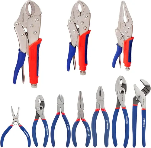 Lo que incluye: Juego de alicates de 7 piezas (alicates de junta de ranura de 8 pulgadas, nariz larga de 6 pulgadas, junta deslizante de 6 pulgadas, nariz larga de 4-1/2 pulgadas, diagonal de 6 pulgadas, linesman de 7 pulgadas, junta deslizante de 8 pulgadas) para bricolaje y uso doméstico y juego de alicates de bloqueo de 3 piezas, mandíbula curva de 10 pulgadas, mandíbula curva de 7 pulgadas y 6 pulgadas -1/2-1 Mandíbula recta en pulgadas Acero pulido forjado a gota: Construcción de cuerpo duradero tratado térmicamente. Consejos: los alicates están cubiertos de grasa para evitar que se oxiden, limpie la grasa antes de usar Filos de corte endurecidos: larga duración, mayor facilidad de corte y rendimiento Las mordazas rectas son para uso universal, mientras que las mordazas curvas demuestran ser más eficientes en el apriete, sujeción y giro de objetos redondos. Ambas mandíbulas están equipadas con dientes reforzados para un agarre más fuerte El tornillo ajustable adicional unido al mango proporciona la presión de sujeción ideal, haciendo que tu trabajo sea más fácil