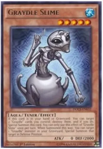 Yu-Gi-Oh! es un juego estratégico de cartas intercambiables en el que dos jugadores se enfrentan entre sí usando una variedad de cartas de monstruo, hechizo y trampa para derrotar a los monstruos de su oponente y ser los primeros en dejar caer los puntos de vida del otro a 0. Nombre de la tarjeta: Graydle Slime Tipo de tarjeta: monstruo EffectTuner Número de tarjeta: DOCS-EN032 Conjunto: Dimensión del caos Atributo : Agua Nivel: 5 Tipo de monstruo: Aqua Código de acceso: 20056760 Texto de la carta: si esta carta está en tu mano o Cementerio: puedes seleccionar 2 cartas "Graydle" que controles; destrúyelas y, si lo haces, Invoca esta carta de Modo Especial. Sólo puedes usar este efecto de "Graydle Slime" una vez por turno. Cuando se Invoca de esta manera: puedes seleccionar 1 monstruo "Graydle" en tu Cementerio; Invócalo de Modo Especial en Posición de Defensa.